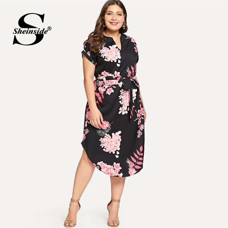 Special Offer Sheinside grande taille élégant imprimé Floral droit ceinturé robe femmes 2019 décontracté retrousser manches Boho robes Midi Discount 40% Today!