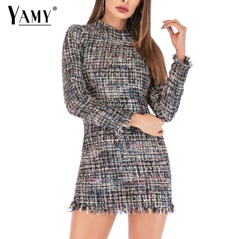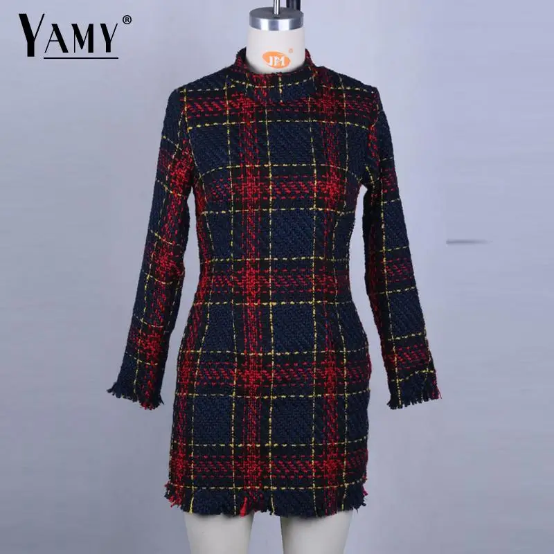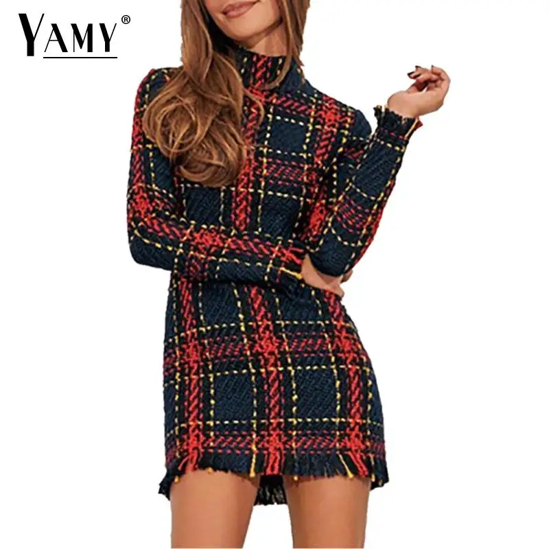 Product Name: Vintage col roulé plaid Tweed robe femmes robe d hiver Sexy mini robe moulante élégant rouge bureau travail robe 2019 vestidos