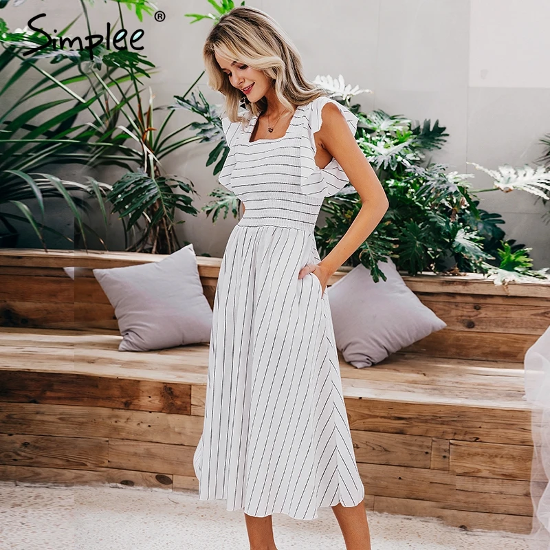 Special Offer Simplee Vintage rayé femmes longue robe à volants lin bleu élégant robe d été 2019 décontracté coton mode femme plage vestidos Discount 44% Today!