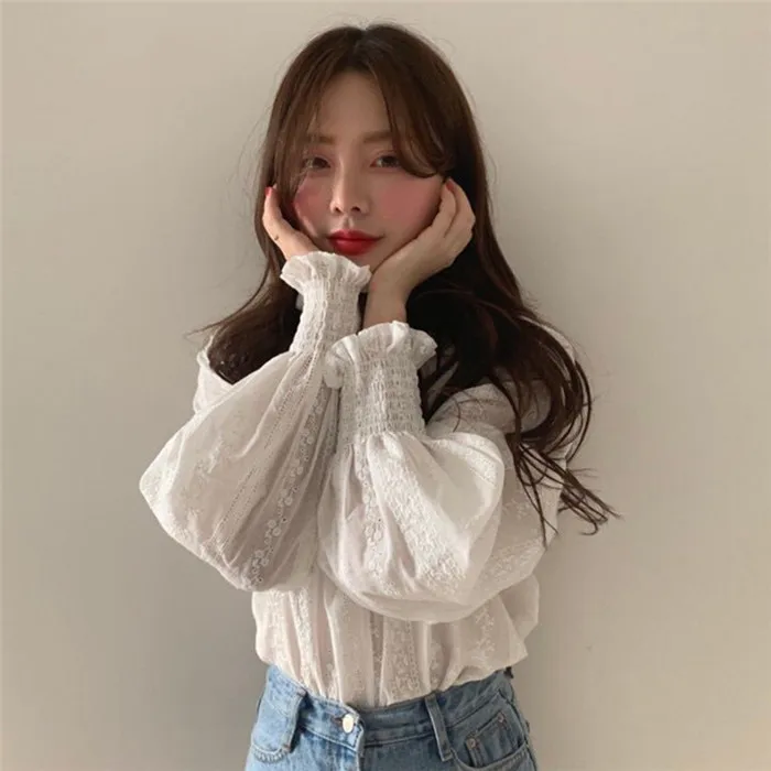 Product Name: 2019 femmes élégantes blouses lanterne manches o cou dentelle blanc imprimé fleuri vintage décontracté doux coréen style femme hauts modis