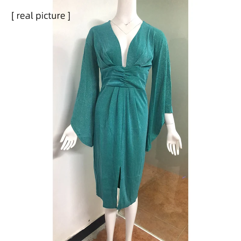 Product Name: Vert élégant Sexy robe été 2019 femmes profonde col en V moulante robes de soirée dames Flare manches Split tunique robe Midi femmes