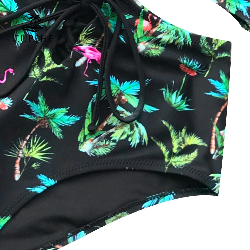 Product Name: Ensembles de Bikini à imprimé palmiers et flamants verts CUPSHE 2019 femmes Sexy Push Up taille haute à lacets maillots de bain en deux pièces