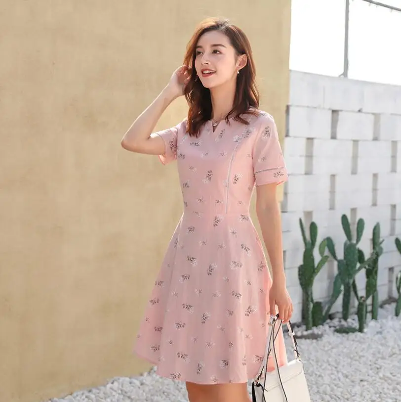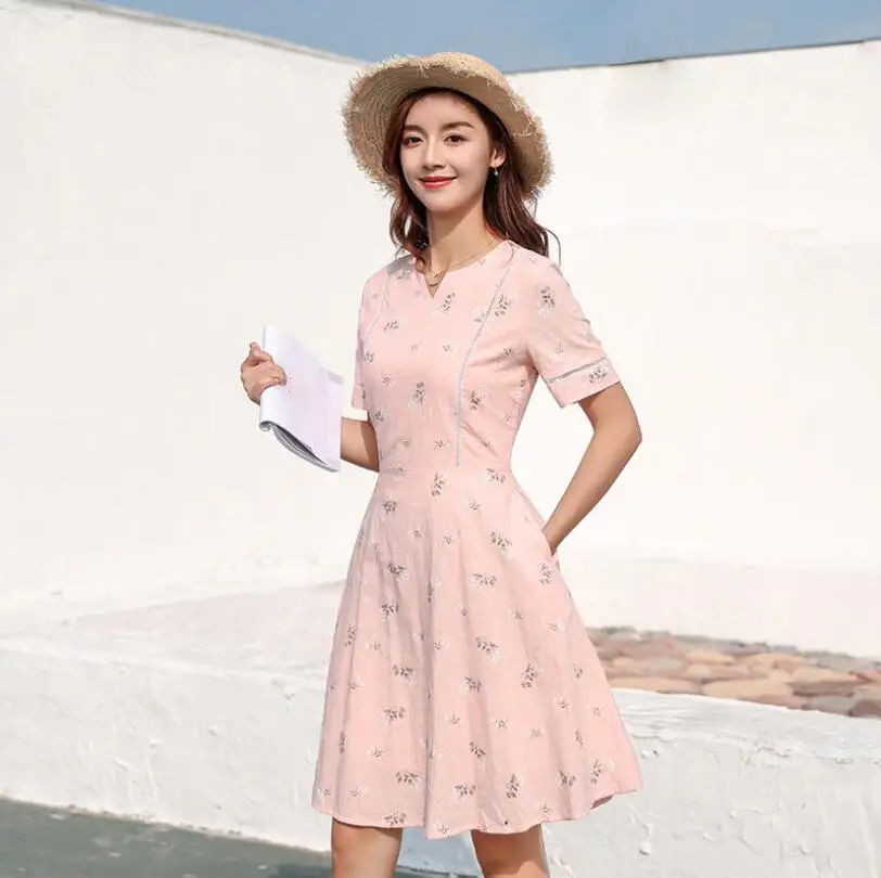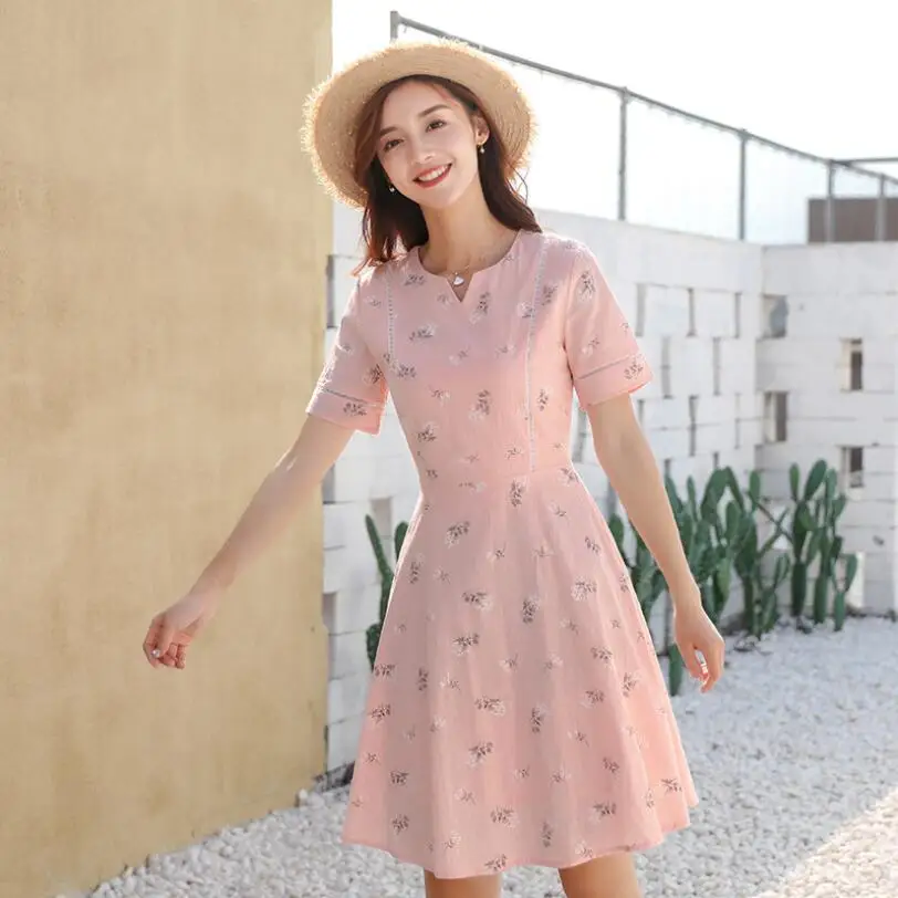 Special Offer 2019 nouvelle version coréenne de robe en coton à manches courtes avec taille haute et impression de longueur moyenne Discount 5% Today!