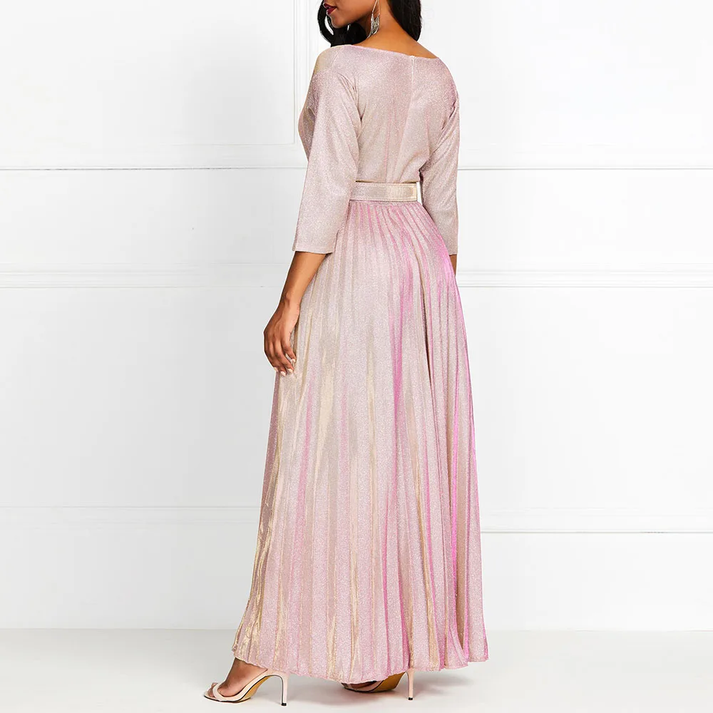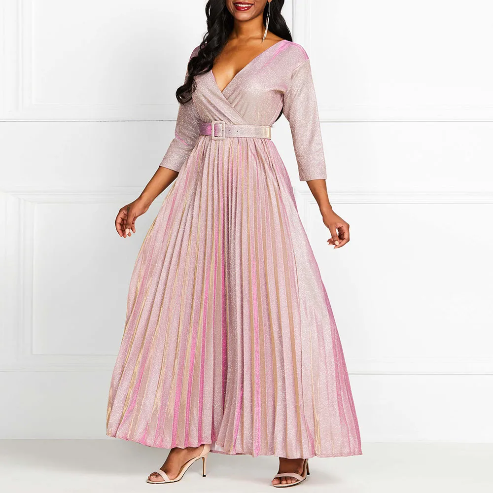 Product Name: 2019 réfléchissant longue robe femmes plissé Sexy profond col en V élégant automne taille haute ceinture paillettes soirée soirée rose Maxi robes