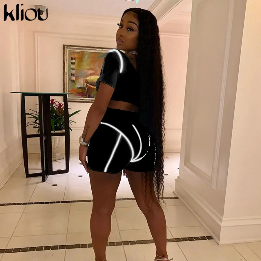 Product Name: Kliou femmes deux pièces réfléchissantes ensemble 2019 été à manches courtes sans bretelles haut court réfléchissant rayé patchwork shorts tenues