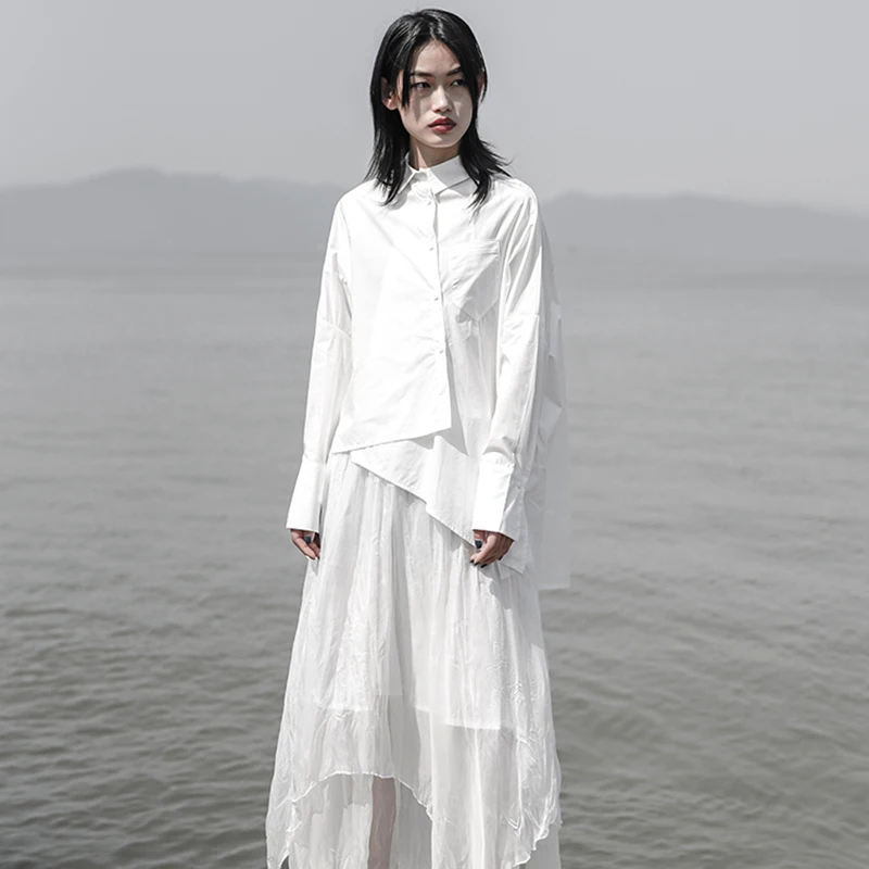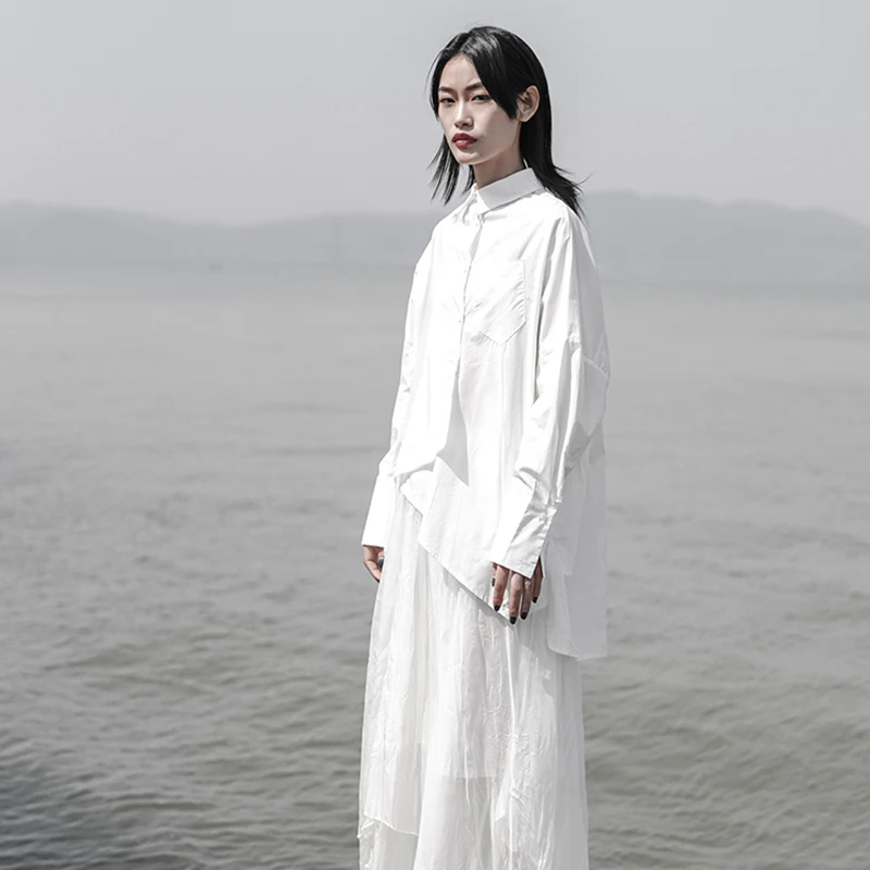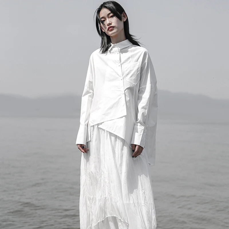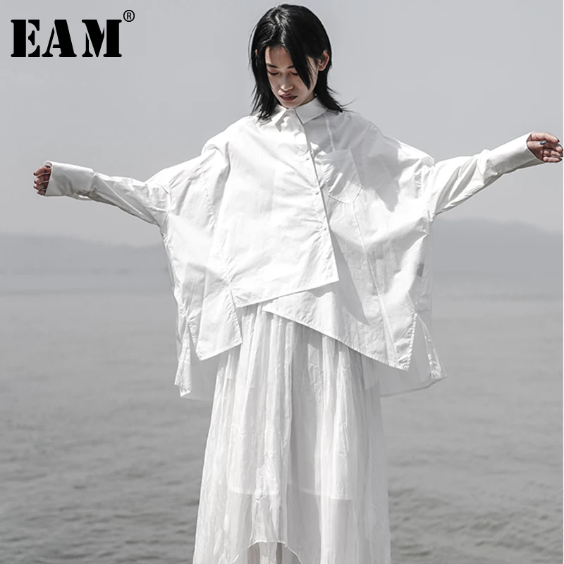 . (55% Off) Achat [EAM] 2019 nouveau automne hiver revers à manches longues blanc ample surdimensionné irrégulière chemise ample femmes Blouse mode marée JS921 Pas Cher Prix.