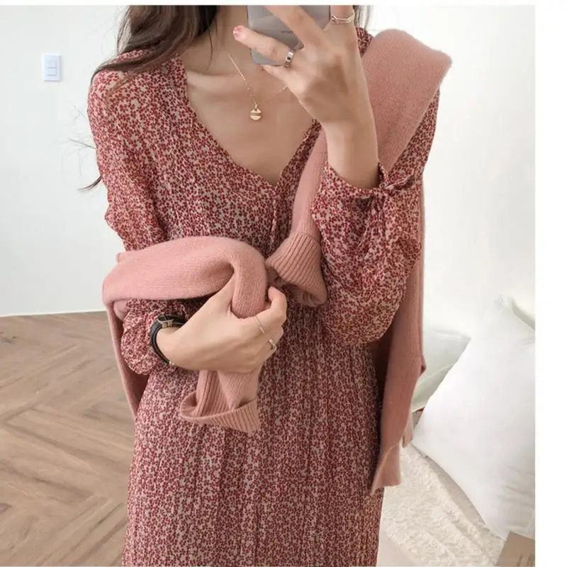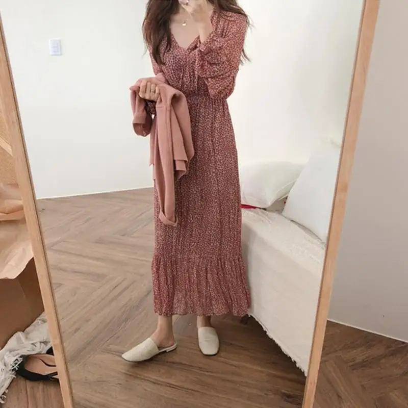 Special Offer 2019 printemps Design rétro robe femmes Style coréen à manches longues col en V robes tempérament dame ébouriffée imprimé Vintage robe 5101 Discount 13% Today!