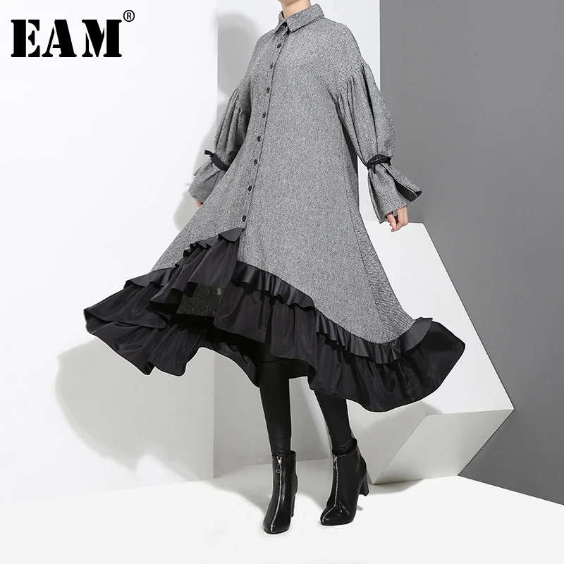 Special Offer [EAM] 2019 nouveau printemps revers à manches longues pansement couleur unie gris grand ourlet irrégulière robe ample femmes mode marée JD717 Discount 22% Today!