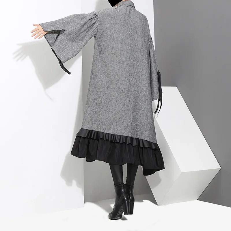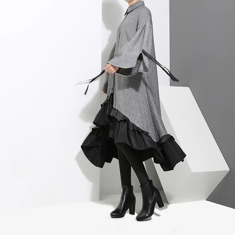 Product Name: [EAM] 2019 nouveau printemps revers à manches longues pansement couleur unie gris grand ourlet irrégulière robe ample femmes mode marée JD717