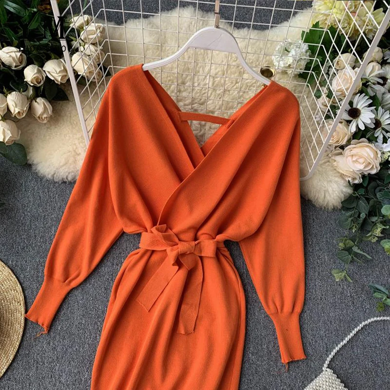 Product Name: YuooMuoo automne hiver femmes tricoté pull robe 2019 nouveau coréen à manches longues chauve souris col en V élégante robe dames Bandage robe