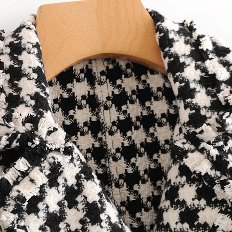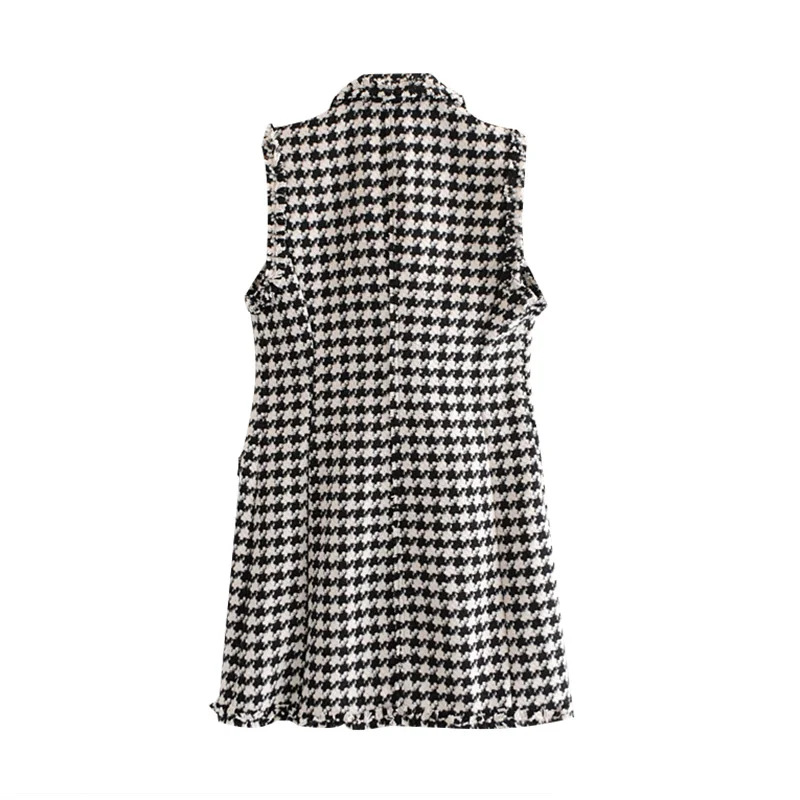 Product Name: Vintage Double boutonnage effiloché Tweed Mini robe femmes 2019 mode revers col sans manches Plaid robes décontracté Vestidos Mujer