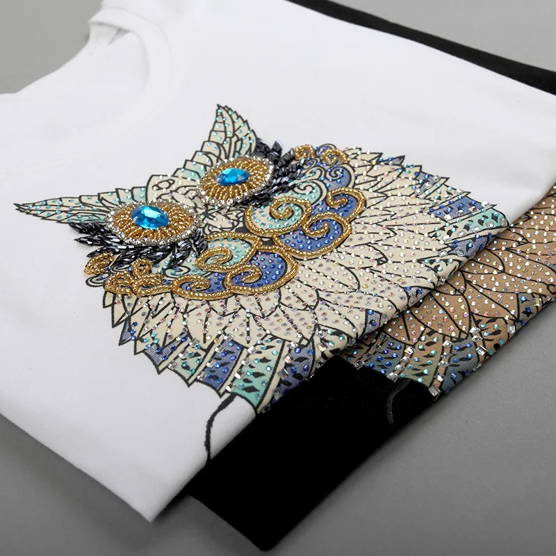 Product Name: 2019 Mode Vintage T shirt D été Femmes Vêtements hauts Perles Diamant Paillettes Hibou Animal T shirt Imprimé Femme Vêtements grande taille