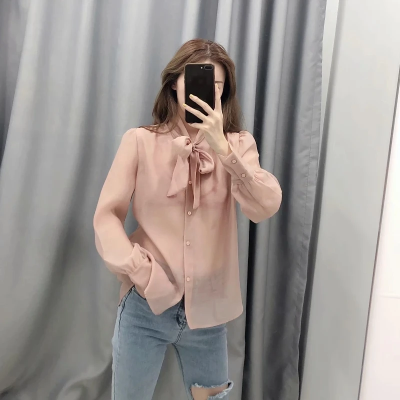 Product Name: 2019 femmes élégant noeud papillon décoration transparente décontracté organza blouse chemisier chemises femmes manches longues loisirs blusa hauts LS4026