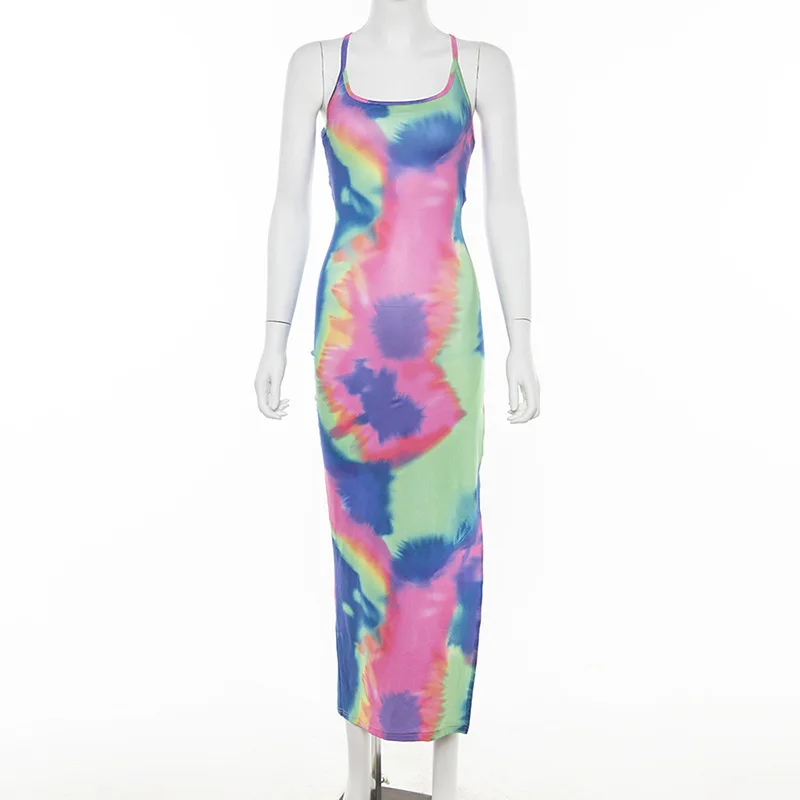 Product Name: ZKYZWX cravate teinture longue robe Maxi pour les femmes d été Vestidos robe de soleil côté fente dos nu à lacets robe de Club de pansement robes de plage