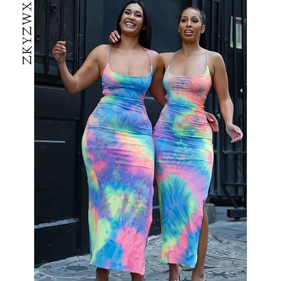 Special Offer ZKYZWX cravate teinture longue robe Maxi pour les femmes d été Vestidos robe de soleil côté fente dos nu à lacets robe de Club de pansement robes de plage Discount 45% Today!