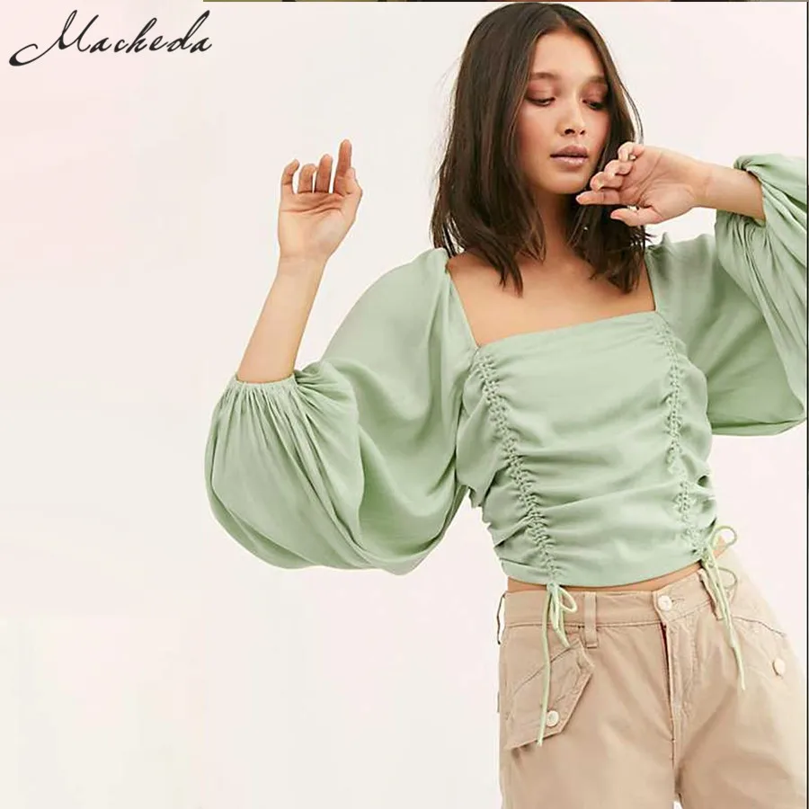 Special Offer Macheda été court carré col femmes plissé réglable cordon hauts Vintage bouffée manches décontracté solide t shirt 2019 nouveau Discount 50% Today!