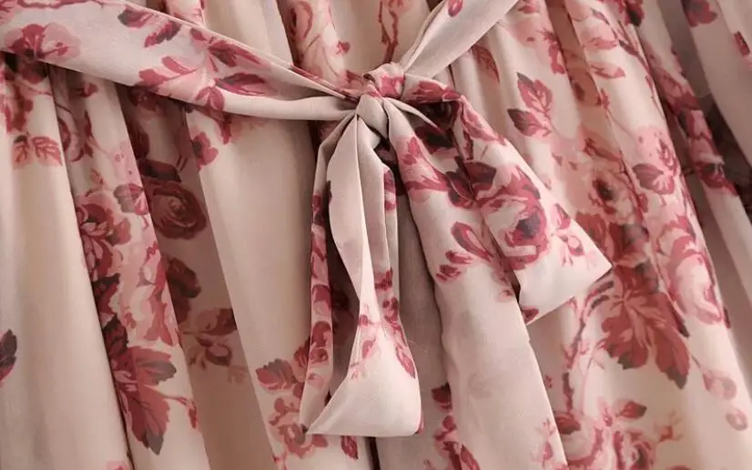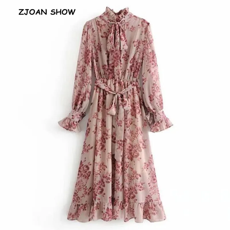 2019 printemps nouveau rose fleur imprimer à manches longues robe avec ceintures femmes Vintage marée Bow col volants ourlet robes Femme VestidoProduct Id: 32965030280