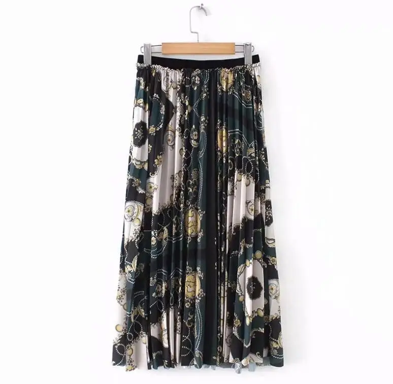 Product Name: 2019 printemps été imprimé rétro Vintage jupe plissée taille élastique imprimer jupe longue