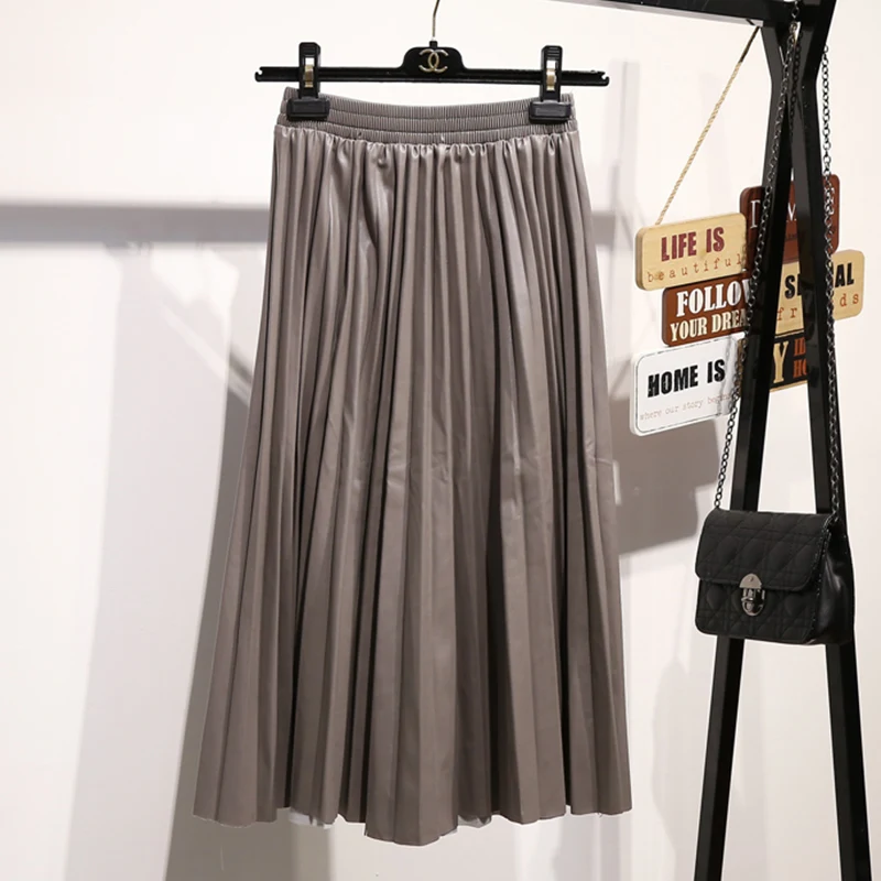 Product Name: Surmiitro PU jupe femmes 2019 automne hiver Midi Long coréen élégant plissé taille haute en cuir jupe femme une ligne jupe de bureau