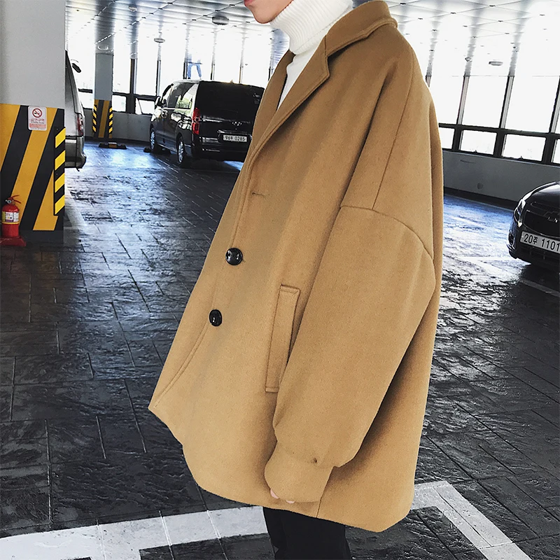 . (34% Off) Vente 2018 Coréen Hiver Homme Mode Marée Col rabattu Manches Chauve Souris Lâche décontracté Noir Kaki Couleur Laine Mélange Manteau Manteau M 2XL Pas Cher Prix.