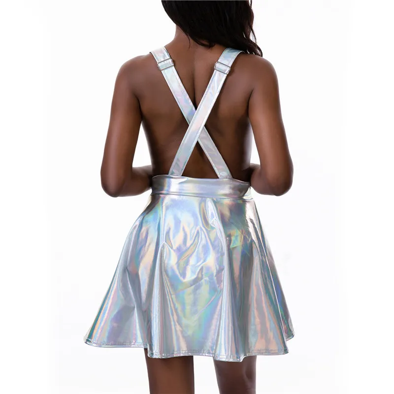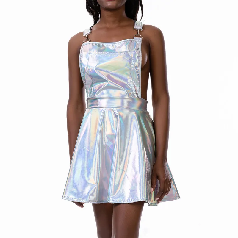 Product Name: Paillettes Laser holographique a ligne robe femmes dos nu Criss croix boucle sangle Look humide 2019 automne mode Sexy Mini robes