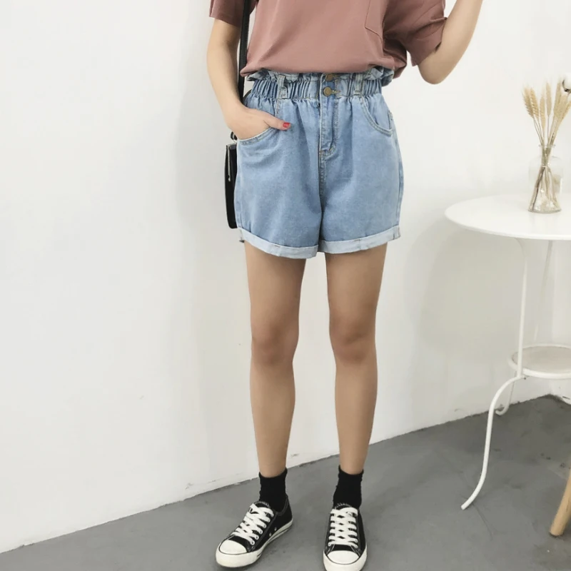 Special Offer 2018 été taille haute Denim Shorts femmes décontracté lâche dames mode retrousser ourlet élastique taille poche bleu blanc Jeans femme Discount 15% Today!