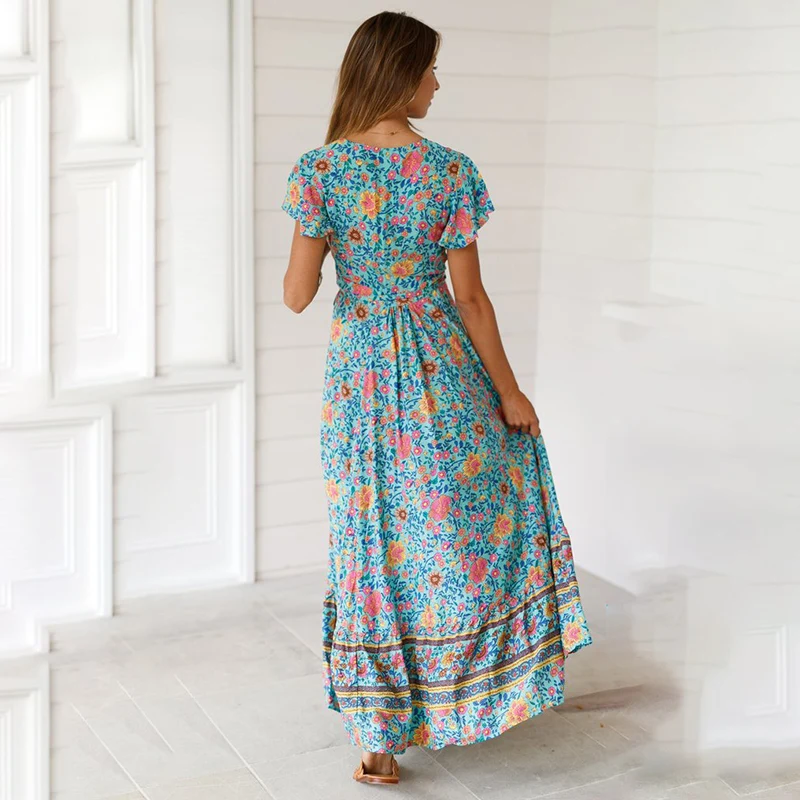 . (40% Off) Achat Surmiitro 2019 printemps manches courtes Sexy profonde V imprimer Wrap robe d été femmes tunique plage robe longue Maxi robe de soirée femme Pas Cher En Ligne.