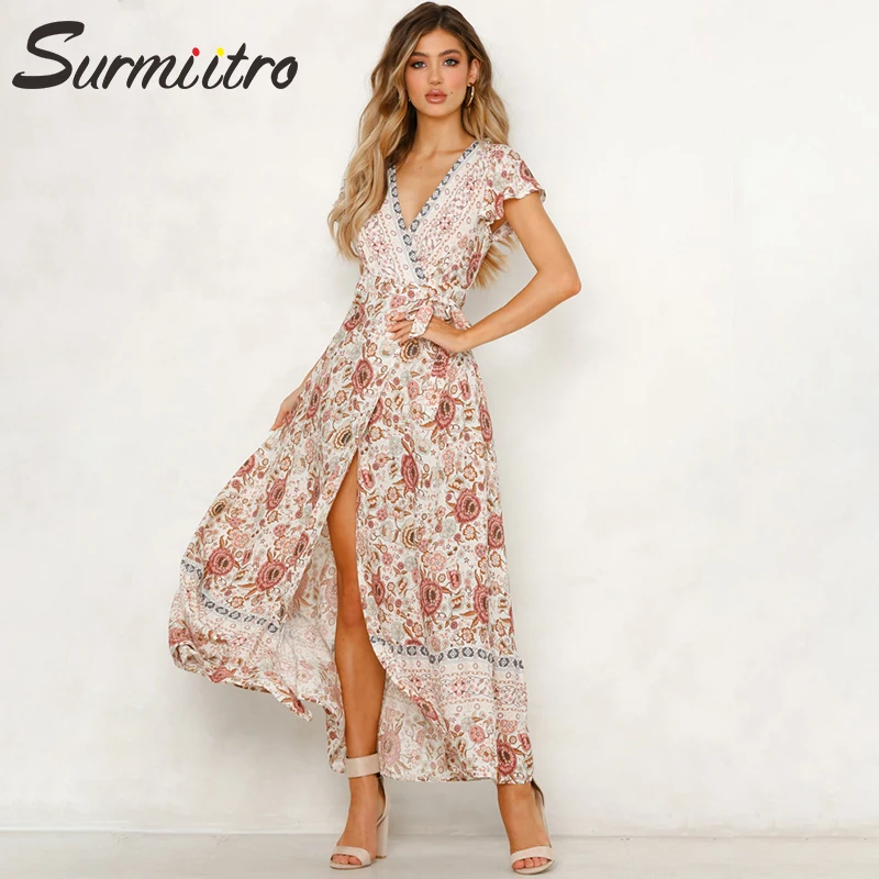 Special Offer Surmiitro 2019 printemps manches courtes Sexy profonde V imprimer Wrap robe d été femmes tunique plage robe longue Maxi robe de soirée femme Discount 40% Today!