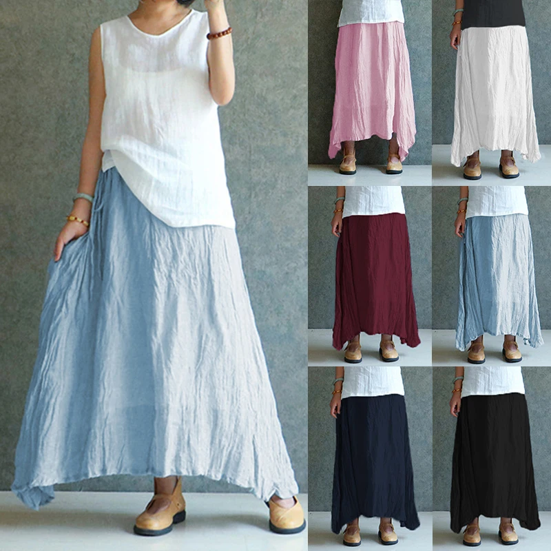 . (46% Off) Vente 2019 été Celmia femmes Vintage lin jupes décontracté lâche solide longue jupe élastique taille plage plissée Maxi jupes grande taille Pas Cher En Ligne.
