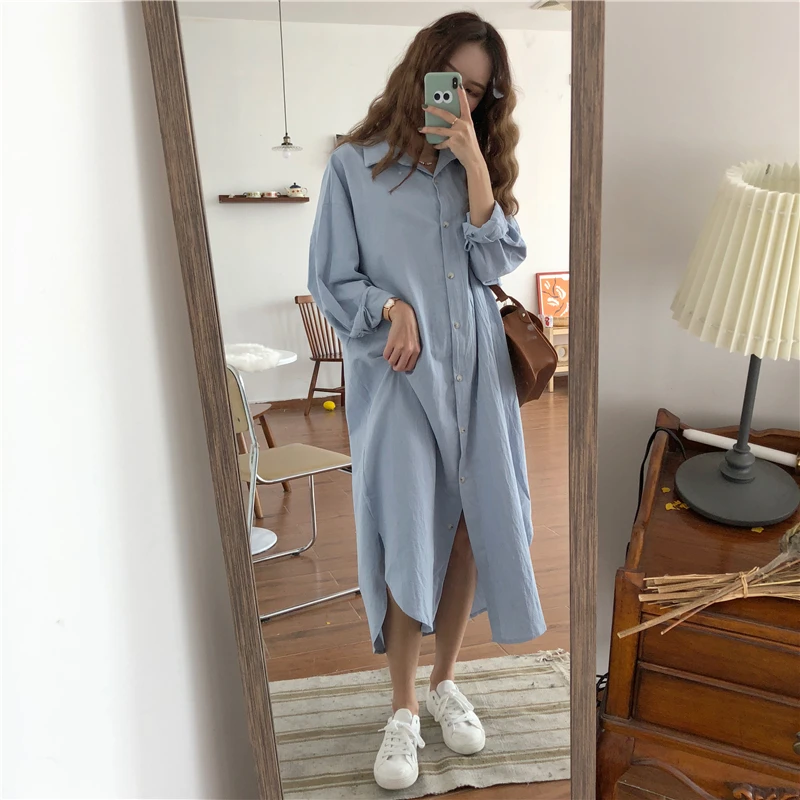 Product Name: Vintage automne femmes longue robe 2019 dame à manches longues coton chemise robe décontracté col rabattu lâche femmes robes de grande taille