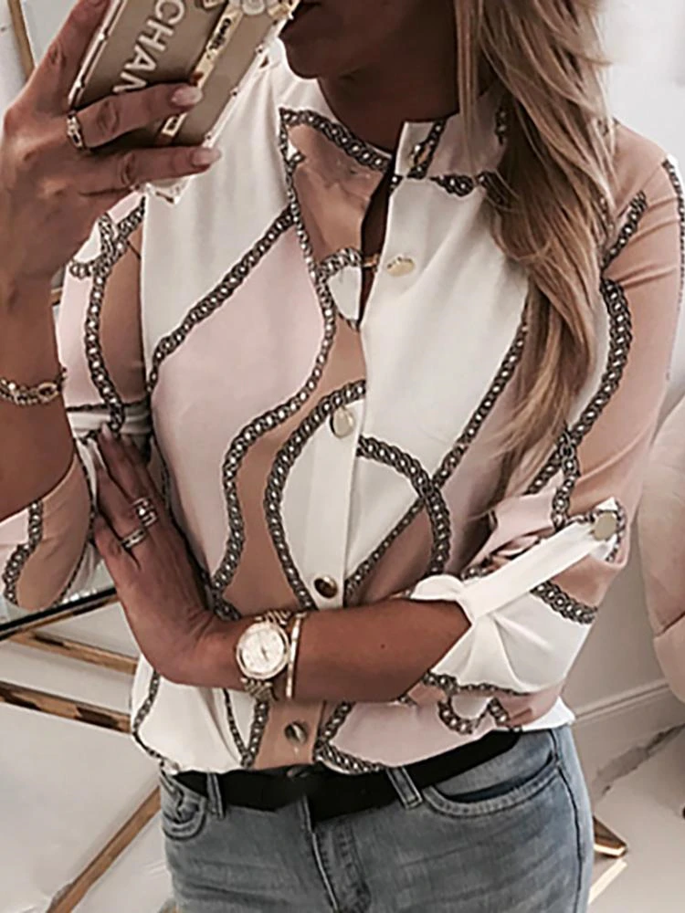 Product Name: 2019 été femmes nouveau élégant tendance loisirs Blouse femme vacances bureau chaîne supérieure bouton d impression à travers décontracté