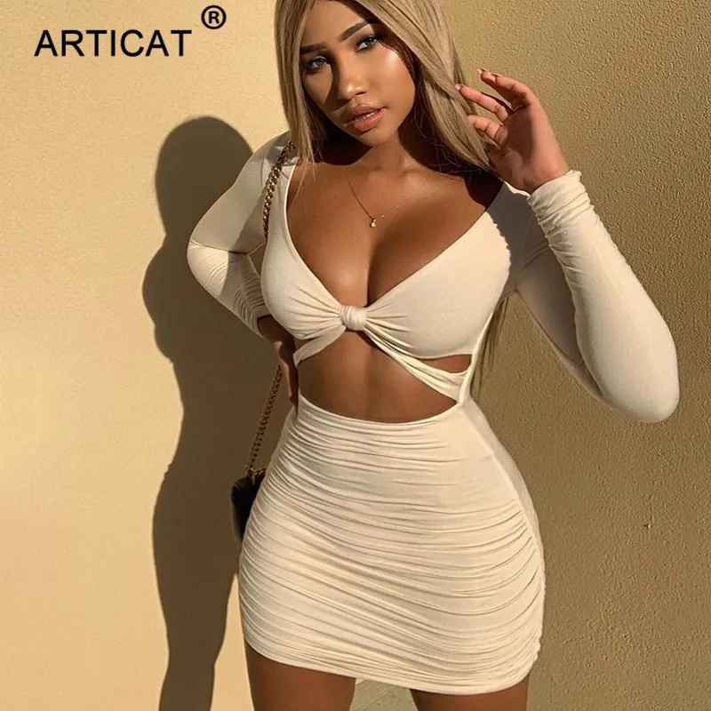 Special Offer Article blanc Sexy évider femmes robe d été 2019 à manches longues col en v moulante plissée courte robe décontracté plage robes de fête Discount 45% Today!